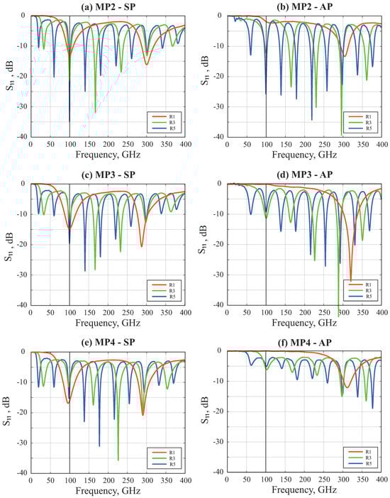 One key point concerning the antenna design is the impedance matching between the input port and the antenna. As mentioned previously, we defined a 75-ohm multipin input port by adjusting the pin diameter. Impedance matching was investigated by simulations of the parameter, as shown in Figure 4. Multipolar antenna simulations were conducted for different excitations (SP or AP) using different resonance order designs (R1, R3, R5). For each simulation, arm lengths were slightly adjusted to optimize impedance matching at 100 GHz; exact antenna dimensions are synthesized in Table 1.