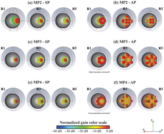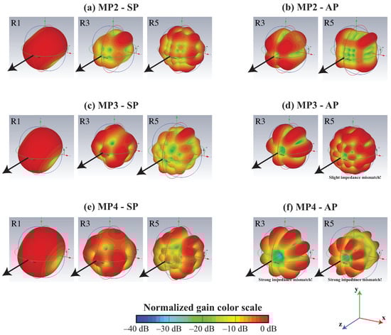 Normalized far-field radiation patterns of the MP3 multipolar antenna for different polarity excitations (SP or AP) and difference resonance-order designs (R1, R3, or R5). Diagrams are simulated for emissions at 100 GHz; the gain colour scale is normalized. Diagrams for alternate polarity at the first resonance (R1) are not represented, as the antennas are not matched in terms of impedance. Some diagrams are shown for cases of slight or strong impedance mismatch (such mismatches are indicated in the figure), as they are representative of these types of antennas and could ultimately be adequate on high-index substrates.