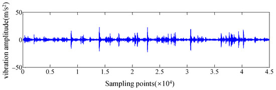 Figure 5 shows the time domain waveform of the vibration signal at the beginning of the service life of a CRDM. Figure 6 shows the time domain waveform of the vibration signal at the end of the life of a CRDM. In the early operation of a CRDM, the vibration signal characteristics are determined by its own structure, and there are some irregular impact signals. When a CRDM operates at the end of its life, due to the degradation of rotating parts, such as wear, bearing failure, etc., a large impact signal appears in the vibration signal, and the frequency amplitude of impact signal increases. There are many interference noises in the vibration signal of a CRDM, so it is difficult to see the fault in the time domain signal collected. When analyzing the status of a CRDM, it is necessary to filter out the noise and interference components in the vibration signal of the CRDM, such as the interference caused by the main circulation pump and power supply, so as to effectively analyze the status of the control rod drive mechanism. The vibration signal of a CRDM at the end of its life is analyzed to verify the effectiveness of the method proposed in this paper.