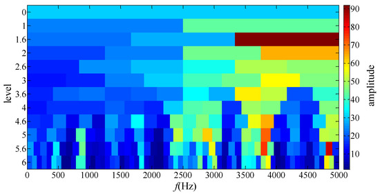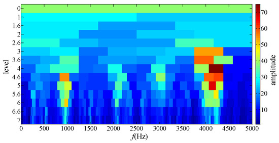 Figure 11 is the IMF component waveform of the end-of-life vibration signal of the CRDM based on CEEMDAACN. It can be seen that the spectral kurtosis of IMF6 is relatively large, situated in the frequency range of 3400–5000 Hz, which contains the degraded characteristic frequency range of the original signal. Similarly, the spectral kurtosis value of IMF7 is relatively large, situated in the frequency range of 3400–5000 Hz, which contains the degraded characteristic frequency range of the original signal. Therefore, IMF6 and IMF7 are added to form the denoised reconstructed signal based on CEEMDAACN-SK. The signal spectral kurtosis diagram after adding IMF6 and IMF7 is shown in Figure 12 and the spectral kurtosis value is the largest, situated in the frequency range of 3400–5000 Hz.