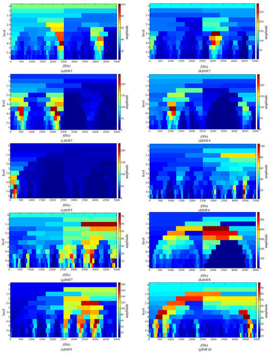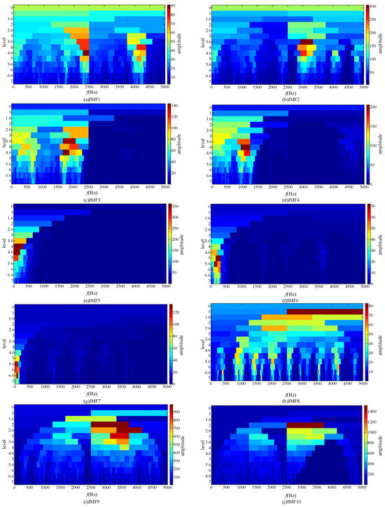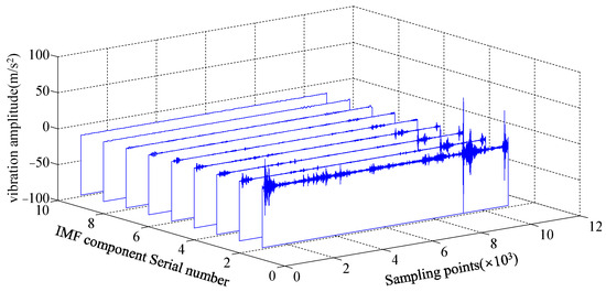 Figure 7 shows the spectrum kurtosis of the vibration signal at the end of the service life of the CRDM. It can be seen that the frequency range of the maximum spectral kurtosis is 4062.7–4370.7 Hz, so this frequency range is selected as the characteristic frequency range of the degradation signal of the CRDM. Further, CEEMDAN and CEEMDAACN are used to decompose the vibration signal at the end of the service life of the CRDM, and 10 IMF components are obtained. Figure 8 is the IMF component waveform of the end-of-life vibration signal of the CRDM based on CEEMDAN. Figure 9 is the IMF component waveform of the end-of-life vibration signal of the CRDM based on CEEMDAACN. For the IMF components obtained by the above two algorithms, the spectral kurtosis diagram is made respectively, and the spectral kurtosis diagram of each IMF component is analyzed to find the frequency interval with a larger spectral kurtosis value and compared with the degenerated characteristic frequency interval to complete the signal reconstruction.