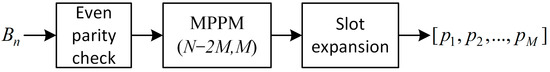 Suppose is n bits of data to be encoded. Firstly, is parity-checked, expanded to n + 1 bits and then the pulse position is encoded with n + 1 bits of MPPM. Finally, the MPPM encoded pulse positions are extended with time slots, i.e., two time slots are inserted after each pulse to obtain a pulse coding sequence that satisfies the constraints of pulse width and time slots of Baker’s AC code, and also has the capability of even-checking. MPCC encoding has the equivalent performance of the AC code, but with a reduced coding complexity. The encoding flow of MPCC is as follows: