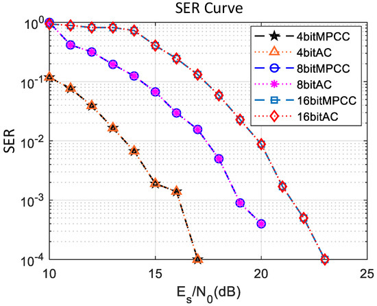 After expanding the MPPM parameters from Table 2 to MPCC coding, the MPCC coding parameters were the same as the AC codes in Table 3. MPCC coding and AC coding were performed for random data streams with 4 bit, 8 bit, and 16 bit bit widths, respectively, and the modulated pulse signals were passed through the AWGN channel, and the SER (Symbol Error Ratio) performance curve is shown in Figure 6 by using and error symbol rate to measure the error symbol performance.