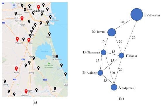 Demand-responsive transportation service layout developed for the case study. (a) Area of the Comunitat Valenciana chosen for the deployment of the service. A single stop per settlement has been kept. Stops used in the example are highlighted in red. (b) Detail of the service layout. Stops are represented as a blue circle. Connections among stops are labeled by the average car travel time in min.