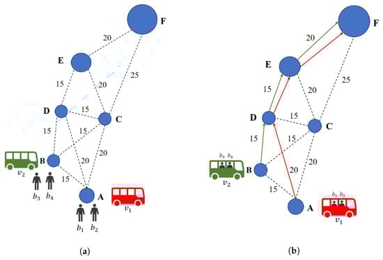The initial scenario defines a travel demand as well as the location and initial itineraries of each fleet vehicle, and can be visualized in Figure 3a. The fleet comprises vehicles and , allocated in stops A and B, respectively, at the beginning of their shift, time . Their itineraries () contain just their current stop, and their routes () are empty. Passenger demand comprises four bookings (, , , and ), each characterized by their origin and destination stops and earliest pick-up time () in min. Table 1 depicts the initial scenario according to the problem formulation.