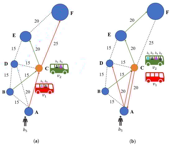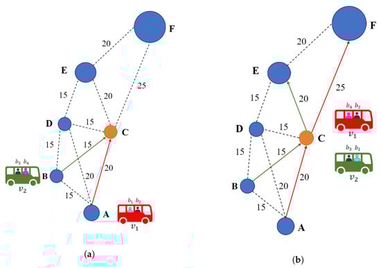 Evolution of the DRT service from the initial scenario to the final solution, now considering stop C as a transfer point, represented by the orange color. Vehicle ’s route is depicted by red arrows, whereas ’s route is depicted by green arrows. (a) Initial passenger–vehicle assignments are preserved. Vehicles now move first towards the transfer point as it is their first stop. (b) Vehicles exchange passengers and and continue their journey, which now differs in the destination stop.