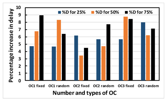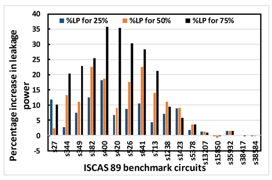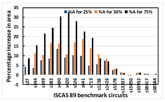 Figure 8 shows that area increases for increasing obfuscation levels up to the s713 circuit, although s27 is an exception. After that, the upper bound of 80 key bits is reached and there is therefore no correlation between area and obfuscation level, with area depending solely on the OC chosen. Similar trends are observed for delay, leakage power and total power. The decreases in area, delay, leakage power and total power in some benchmark circuits with increasing obfuscation levels are due to the upper bound of 80 key bits, randomness of the chosen OC and its area, the contribution of delay towards the worst-case scenario, leakage power and total power requirements. Delay is an exception because the old critical path is not touched when OCs are inserted. Therefore, after synthesis, delay may even decrease, as seen from