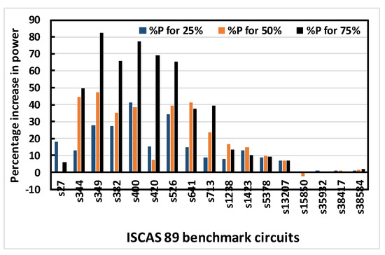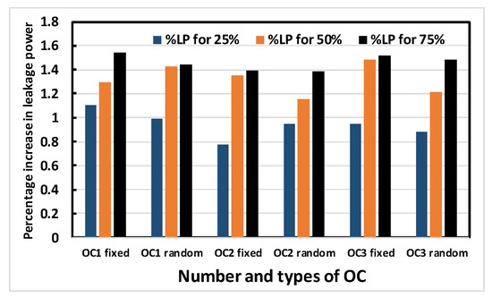 Figure 11) show the percentage increase in area, delay, leakage power and total power for obfuscating different ISCAS 89 benchmark circuits using 3 different OCs randomly chosen to obfuscate 25%, 50% and 75% of the modifiable nodes, respectively.