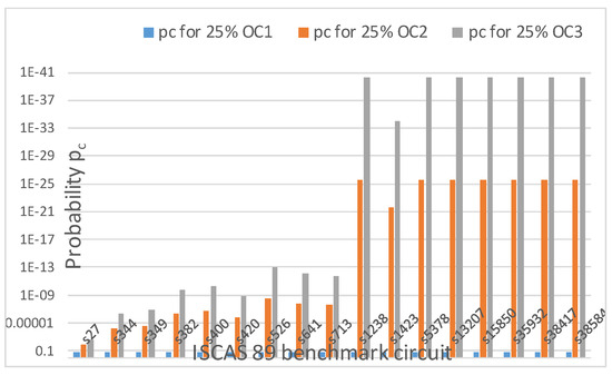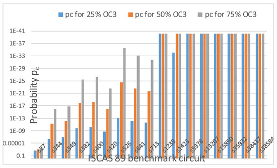pc, decreases if the obfuscation level is increased continuously from 25% to 75% unless the upper bound of 80 keys is reached or the number of OC is increased from 2 to 3 (OC2 to OC3). As the upper bound of 80 keys is reached,