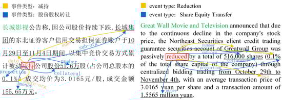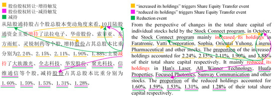 However, a sentence may contain multiple events, and the arguments and triggers of these events have complex overlapping phenomena. We summarize this into three situations: (1) Different event types may be triggered by the same trigger. The trigger “减持” (reduced its holdings) marked in red in Figure 1 triggers both the shareholding reduction event and the share equity transfer event. (2) The same argument plays different roles in different event types. In Figure 1, “大族激光” (Han’s Laser) plays the role of obj in the “股份股权转让” (share equity transfer) event, and also plays the target-company role in the share equity transfer, which is triggered by “减持” (reduced its holdings). (3) The same argument plays the same role in different events of the same event type. In Figure 1, the “股份股权转让” (share equity transfer) event appears twice in the sentence, both occurring in “10月” (October). In FewFC (a Chinese financial event extraction dataset) [11], about 13.5% of the sentences have trigger overlap problems, and 21.7% of the sentences have argument overlap problems. The same event type appears repeatedly in 8.3% of the sentences.