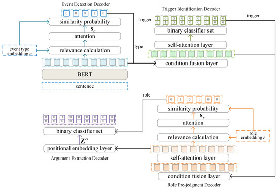 Most previous studies partially addressed overlapping issues and did not cover all the above situations. In 2019, Yang et al. [12] utilized a staged pipeline approach for event trigger and argument extraction. Nevertheless, this method overlooked the challenge of trigger overlap. In 2020, Xu et al. [13] used a joint extraction framework to solve the role overlapping problem. Xu defined event relationship triples to represent the relationship between triggers, arguments, and roles, thereby converting the argument classification problem into a relationship extraction problem. In 2020, Huang et al. [14] proposed using a hierarchical knowledge structure graph containing conceptual and semantic reasoning paths to represent knowledge. They employed GEANet to encode intricate knowledge, addressing the issue of trigger extraction in nested structures within the biomedical domain [14]. In 2022, Zhang et al. [15] designed a two-stage pipeline model in which the trigger is identified using a sequence annotation approach, and overlapping arguments are identified through multiple sets of role binary classification networks. In 2023, Yang et al. [16] used a multi-task learning model to extract entity relationships and events, in which a multi-label classification method is used to settle the overlapping role problem shared by these two tasks.