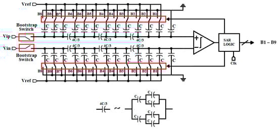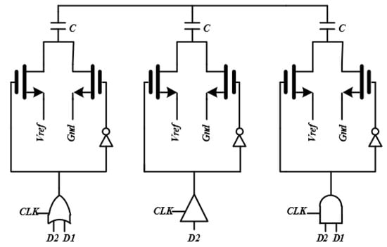 The capacitive DAC utilized in SAR ADC forms one of the power-thirsty blocks [,]. Its power consumption is mainly due to the DAC’s switching activity as well as the total capacitance of the DAC. This paper mainly focuses on reducing the total capacitance of the DAC and, thus, reducing its area and power consumption. The majority of SAR ADCs utilize charge-scaling DACs to gain the advantage of low power dissipation, as the capacitive array does not dissipate static power. Furthermore, the offset of the DAC can also be easily compensated for if a switch capacitor circuit is used. However, the value of capacitors used in the DAC rises exponentially with the number of bits []. For this reason, charge-scaling DACs employed in high-resolution SAR ADCs suffer from problems like mismatch of the capacitors, large area, high power consumption and inaccuracy of the DAC [,,].