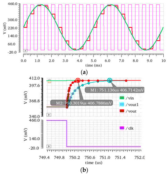 To evaluate the performance of the proposed bootstrap switch, it is used as a sample and hold circuit and is simulated using cadence virtuoso 45 nm CMOS technology files with a supply voltage of 0.45 V by applying a sinusoidal input of 0.45 Vp-p at 0.2 KHz frequency using a sampling clock of 2 KHz frequency, suitable for in vivo biosensing applications [,,,,]. The post-layout is shown as the transient simulation result in Figure 3a. For fair comparison, bootstrapped switches from [,] are re-simulated with the same input parameters and then compared. The power consumed by the proposed switch is 111.9 pW, which is 23.5% less than [] and 18.6% less than the bootstrap switch proposed in [] because the proposed circuit benefits from the advantage of a lower transistor count and simplicity in its design. Moreover, the simulated leakage power is only 19.9 pW, about 17.7% of the total power, which is not considerable; hence, the design is not enhanced with the leakage reduction techniques.