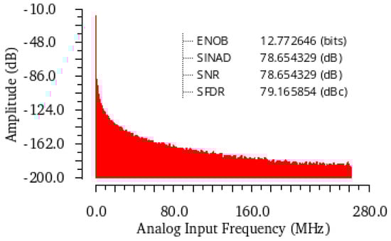 Figure 4 shows the simulated FFT plot of the proposed bootstrap as a sample and hold circuit that achieves an ENOB of 12.77 bits, SFDR of 79.16 dBc and SNR of 78.65 dB, which are reasonably good results at lower sampling rates compared with those mentioned in [,] that achieve similar results at higher sampling rates. Hence, the proposed bootstrap switch is a better choice to be used in biomedical applications as a sample and hold circuit, which requires a good ENOB and SNR at low frequencies with low power consumption.