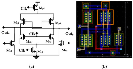 Figure 5a represents the proposed dynamic comparator, intended to be used in SAR ADCs applicable in implantable sensors. In this circuit, when Clk is high, Mn1, Mn2 and Mn3 are ON, discharging the nodes 1 and 2 to ground. Subsequently, when Clk is low, Mp1 is turned on, bringing Mp2 and Mp3 to an ON state by making the Vgs of these transistors negative. Hence, nodes 1 and 2 are charged to Vdd. These nodes are then discharged to the ground based on the differential inputs applied to Mn4 and Mn5. Figure 5b represents the layout of the proposed dynamic comparator design.