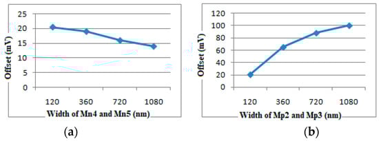 The static offset of the cross-coupled pMOS transistors is also inversely proportional to their widths as they generate constant current; so, in contrast to the abovementioned, the widths of these transistors must be increased. Hence, design care is taken regarding the aspect ratios to have a trade-off between offset voltage and transistor size. Simulations of offset contributed by each mismatch transistor pair are shown in Figure 6. As mentioned, Mn1, Mn2 and Mn3 are off during the comparison phase, and Mp1 is on but is not affected by the differential operation; hence, it does not influence the static offset.