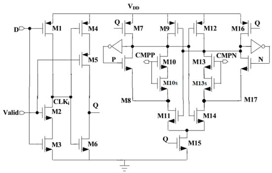 This can be overcome by using a stacking of transistors technique to reduce leakage currents, reducing the leakage power thereafter. Figure 8 represents the modified SAR control logic designed by stacking the transistors driven by the comparator outputs in the bit-slice unit of []. Table 5 mentions the leakage power comparison of the bit-slice unit modified with that of the units from [,]. It proves that a stacked transistor bit-slice unit has low leakage power, thus contributing to the low power consumption of the entire SAR logic block.