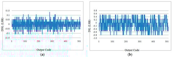 Figure 9a,b show the simulated differential non-linearity (DNL) and integral nonlinearity (INL) of the proposed SAR ADC. The DNL is in the range of −0.10/+0.13 LSB while the INL is within −0.8/+0.5 LSB. These values agree with the linearity range demand [,,]. These are due to small changes in the output codes related to the MSB capacitor as it switches from low to high. This may be owing to the effect of the parasitic capacitance on the output.