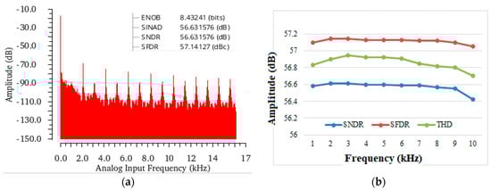 Figure 10a shows the simulated FFT spectrum of the proposed SAR ADC with a 0.4 V, 8 Hz sinusoidal input signal with a 0.4 V supply and 2 kS/s sampling rate. The obtained signal-to-noise ratio (SNR) is 56.63 dB, equivalent to an effective number of bits (ENOB) of 8.43 bits and a spurious-free dynamic range (SFDR) of 57.14 dB. Figure 10b plots the simulated SNDR, SFDR and THD against the input frequencies that remain almost constant up to 7 KHz and drop later.