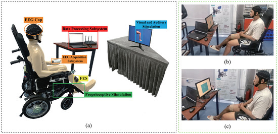 Hardware structure of proposed system: As shown in Figure 1a, the hardware structure of the lower-limb MI-BCI system mainly consisted of an EEG acquisition subsystem, multimodal stimulation subsystem, and a data processing subsystem. The EEG acquisition subsystem included an EEG cap and a 30-channel active Bio-Signal EEG amplifier (Poseidon, Jiangsu, China). Electrodes were placed on the scalp at locations overlying the motor cortices. The Pz electrode was used for positioning according to the specifications of the International 10-20 Electrode System. The ground electrode was placed on AFz and the reference electrode was placed on the left earlobe. All impedances were maintained at below 20 k at the onset of each session. The sampling rate was set to 250 Hz. The multimodal stimulation subsystem included visual, auditory, FES, and proprioceptive stimulation. The visual stimulation consisted of a video of the lower limbs laid down or being raised while the participant performed lower-limb movement imagery. The auditory stimulation was a notification sound of “Please raise your legs”. The proprioceptive stimulation consisted of a single-degree-of-freedom mechatronic device installed on a wheelchair. The FES included two pairs of self-adhesive surface electrodes fitted onto the right leg of the participant.