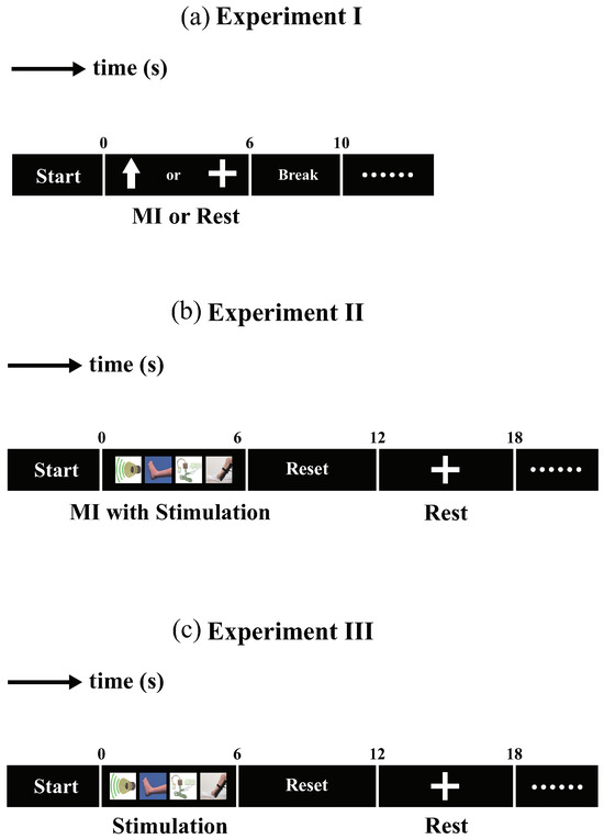 - Experiment I: Lower-limb motor imagery experiment. The structure of each trial is illustrated in Figure 2a. After the beginning of the experiment, a cue in the form of an arrow pointing up or a cross appeared and remained on the screen for 0–6 s. During the tasks, an upward arrow was set as a cue to prompt motor imagery, while a cross was shown as a cue to rest. The participants were instructed to begin imagining the leg movement until the arrow disappeared from the screen. There a 4 s break between tasks. A block consists of 50 trials, 25 for each of the two cues. Each participant completed three blocks, yielding a total of 150 trials.