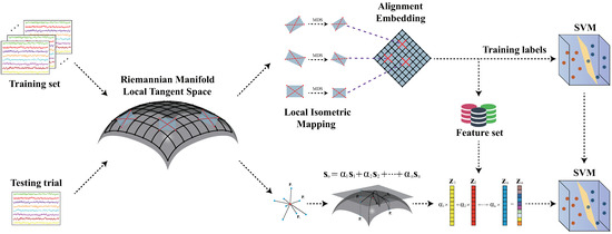 After characterizing the relationships between EEG samples in the Riemannian manifold, we learned the basis from the training dataset using an unsupervised Riemannian manifold learning method. More specifically, we first designed a local isometric mapping to preserve the real relationships between the EEG samples as effectively as possible from the Riemannian manifold to a low-dimensional subspace. For a data point in the Riemannian manifold, we selected the k-nearest neighbor of according to the Riemannian geodesic distance. The local tangent space is defined as the tangent space at , and all of its neighboring points are mapped into tangent space,