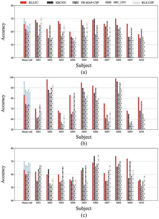 Furthermore, to demonstrate the generalization capacity of the proposed model, we compared the proposed algorithm with four other competing classification algorithms, that is, SBCNN, FB-MAP-CSP, SRC_UFU, and RLS-CSP, using 5-fold cross-validation. As shown in Figure 4, the RLLFC method outperformed the competing methods for all subjects and had a higher accuracy and lower standard deviation than those of the other competing methods. This indicates that our RFFLC model is more stable than the other four methods. In addition, we provide a significance analysis of the cross-validation results in Figure 4. From the paired t-test results in Table 1, it is clear that the differences between RLLFC and other competing methods are statistically significant, supporting the superiority of RLLFC’s generalization capacity.