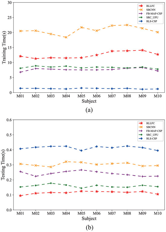To demonstrate the efficiency of the testing processing of the RLLFC algorithm, we also compared the computational loads of the proposed algorithm with those of the competing algorithms using Python 3.6 and a 3.2 GHz CPU. Figure 5 show the training and testing times of each algorithm. The training time denotes the computational load of the model training on the training dataset, whereas the test time is the mean computational load of the processing of 50 trials for classification. As shown in Figure 5, the training times of RFFLC were shorter than those of SBCNN for the in-house datasets and longer than those of FB-MAP-CSP and RLS-CSP, because calculation of the Riemannian distance requires more time for high-dimensional manifolds. However, the test time of RFFLC was the shortest in-house datasets. The RFFLC method takes a mean time of 0.13 s for decoding of a single trial. Therefore, considering both time-consumption and performance for in-house datasets, RFFLC presents a comparable advantage over the other options.