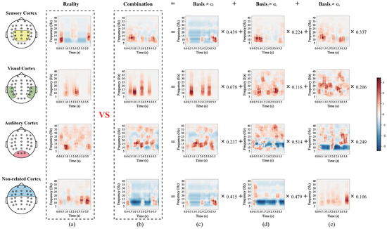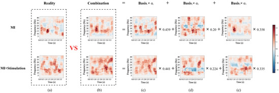 The time frequencies of the lower limb movement imagery with and without stimulation in CPZ electrodes from subject M08 of the in-house dataset. (a) The real time-frequency diagram of the EEG signal. (b) A combination of the time-frequency diagrams. (c) Time-frequency diagram of basis 1 corresponding to the EEG signal. (d) Time-frequency diagram of basis 2 corresponding to the EEG signal. (e) Time-frequency diagram of basis 3 corresponding to the EEG signal.