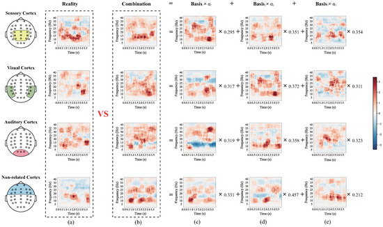 The four brain cortex mean time-frequencies of the lower-limb movement imagery with stimulations from subject M08 of the in-house dataset II. (a) The real time-frequency diagram of the EEG signal. (b) Combination of time-frequency diagrams. (c) Time-frequency diagram of basis 1 corresponding to the EEG signal. (d) Time-frequency diagram of basis 2 corresponding to the EEG signal. (e) Time-frequency diagram of basis 3 corresponding to the EEG signal.