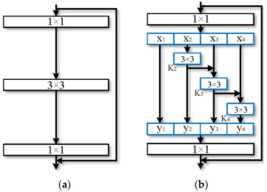Gao et al. [12] designed a new multi-scale backbone model called Res2Net. Res2Net can improve the feature extraction performance without increasing the computational load, which is very important in object detection, semantic segmentation, and instance segmentation tasks. Res2Net constructed the hierarchical residual class connection, extracted more detailed features, and improved the partition accuracy [22]. The structural diagram of Res2Net is shown in Figure 2. The left side depicts ResNet’s basic CNN structure, and the right side represents Res2Net in Figure 2.