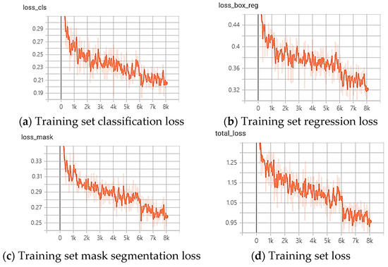 Figure 6 demonstrated that the loss function curve rapidly decreases during the training process. The classification loss, detection regression loss, mask loss, and total model loss on the training dataset were all in a convergent state, which indicates that the model is in multiple task branches of the training set. Therefore, both have a good learning effect.