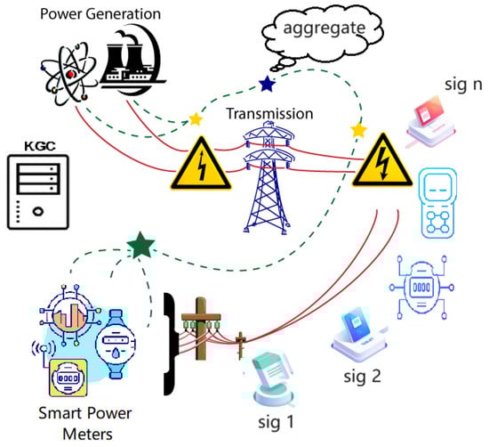 In addition, due to the high real-time requirements of data in the power system, the signature algorithm used must be able to calculate quickly [3]. The terminal node may generate electricity data at any time, and the server will receive multiple data streams from multiple nodes at the same time. The server must be able to quickly process signature verification, which requires the signature algorithm to preferably support batch verification. In these systems, both efficiency [4] and privacy-preserving properties [5] need to be taken into consideration. Signatures that support batch verification can solve this problem. Namely, the signatures on the data collected from various sensors and other equipment can be aggregated in a certain node before being transmitted to the center and can later be verified together. The framework is shown in Figure 1.