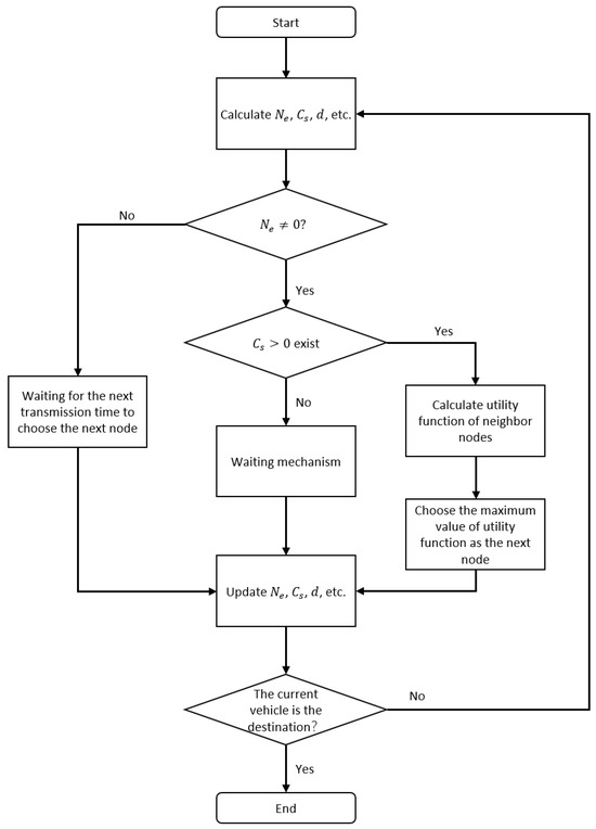 On the basis of the proposed utility function, in this section, we design a secure vehicular network routing mechanism to improve the secrecy performance of the transmission process. The routing mechanism takes into account common vehicle situations. In addition, according to the requirement of utility function, there may be no alternative route choice, and we design a specific waiting mechanism to deal with this situation. The flowchart of the proposed routing mechanism is shown in
