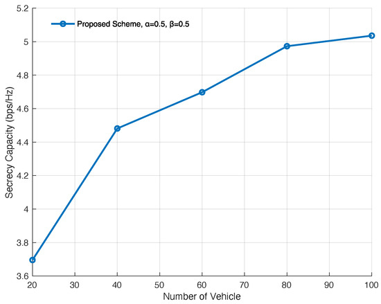 = 0.1, the secrecy capacity of 100 vehicles can be twice as high as that of 20 vehicles. Moreover, the growth trend of the two curves,