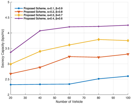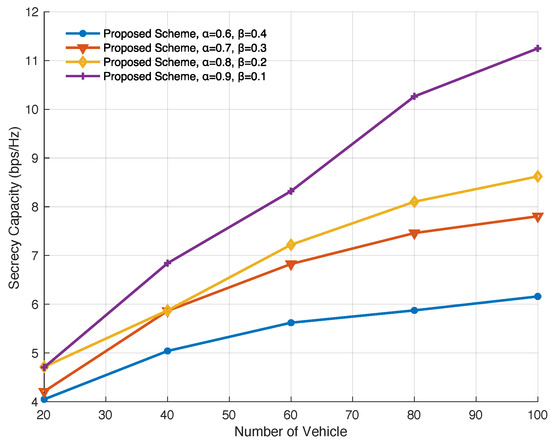 = 0.9, when the number of vehicles is 20, 40, and 60, the change in secrecy capacity is not significant. Until the number of vehicles is 80 and 100, the secrecy capacity shows little improvement. This illustrates that when the weight of