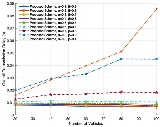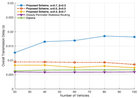 0.1, the overall transmission delay is significantly higher than other situations when the number of vehicles is larger. This is because when the number of vehicles is larger, there are more available vehicles, and the closer vehicle is selected in the routing process. With the number of selected vehicles increasing, the time for routing and waiting at each vehicle increases, which causes a high overall transmission delay.