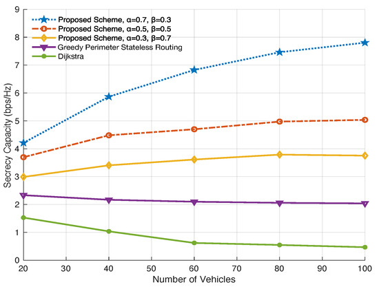 = 0.5, i.e., the security factor and the transmission factor in the utility function are equally weighted. It can be observed that with the increment of the number of vehicles, the value of the secrecy capacity is increasing significantly. This is because the more the number of vehicles, the smaller the distance between two adjacent vehicles and the more next-hop vehicles that can be selected within the communication range, which leads to the greater value of the utility function. At the same time, we can notice that when the number of vehicles increases from 20 to 40, the secrecy capacity increases significantly. When the number of vehicles changes from 40 to 80, the secrecy capacity increases slowly. Moreover, there is little difference between the secrecy capacity of 80 vehicles and that of 100 vehicles, which indicates that the secrecy performance of the vehicular network reaches a stable value when the weight of