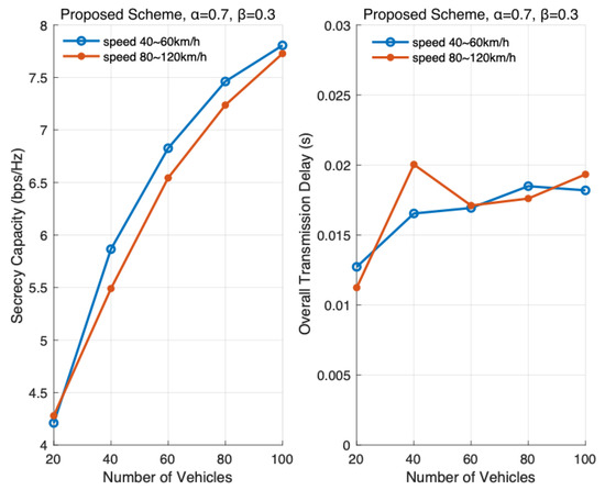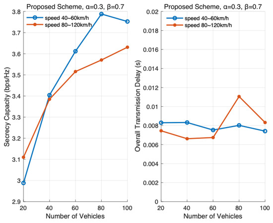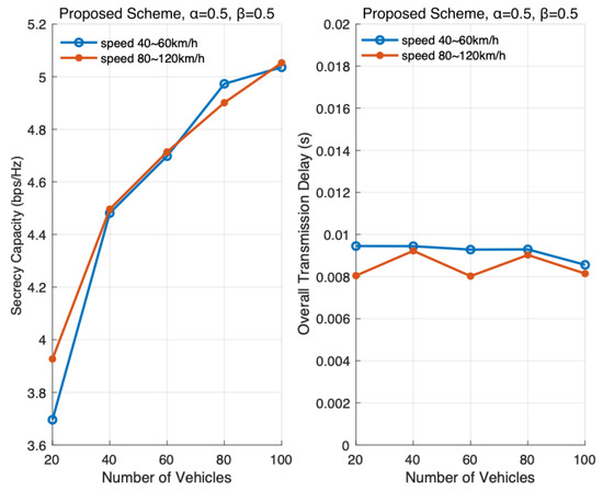 Figure 11, when the number of vehicles is 20 and 100, the secrecy capacities almost overlap under the two-speed conditions. When the number of vehicles is 40, 60, and 80, the secrecy capacities decrease slightly under the high-speed condition while it remains relatively high. It illustrates that the VANET can maintain high stability with the proposed design. When the number of vehicles is 40, the transmission delay in the high-speed situation is slightly higher than that in the low-speed situation. By comparing