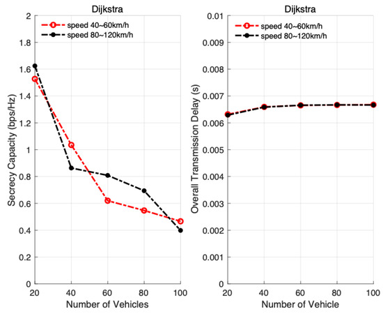 Figure 12, we find that the secrecy capacity achieved by the Dijkstra algorithm decreases significantly as the number of vehicles increases in both medium and high-speed situations. Moreover, the value of secrecy capacity achieved by Dijkstra is very low for any number of vehicles. At each specific number of vehicles, the difference in the secrecy capacity is not very big. It illustrates the poor secure performance and bad dynamic adjustment of Dijkstra. The overall transmission delay remains almost the same at different speed situations and only slightly increases with the increase in the number of vehicles without significant changes. From