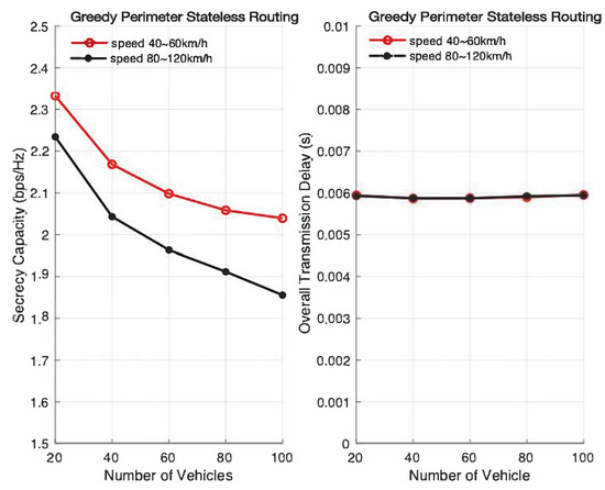 Figure 13, it can be seen that the secrecy capacity achieved by the GPSR algorithm also decreases as the number of vehicles increases. For the curve ranging from 80 to 120 km/h, the value of the secrecy capacity is smaller and the decline is greater than that of the curve ranging from 40 to 60 km/h. There is not much difference in overall transmission delay under two different vehicle speeds and different numbers of vehicles. By comparing