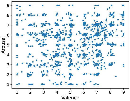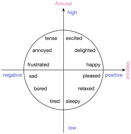 Representation of emotions is usually divided into two perspectives: the discrete perspective and the dimensional perspective. The discrete perspective analyzes emotions in such a way that each particular emotion (e.g., fear, sad, happy, etc.) is mapped to its unique environmental, physiological, and behavioral parameters [4]. From a dimensional perspective, human emotions are represented in relation to several basic dimensions. The two-dimensional representation model of emotion was first proposed by Russell [5], with valence indicating the pleasantness of the emotion, ranging from negative to positive, and arousal indicating the intensity of the emotion. Figure 1 depicts emotional valence arousal two-dimensional space model.