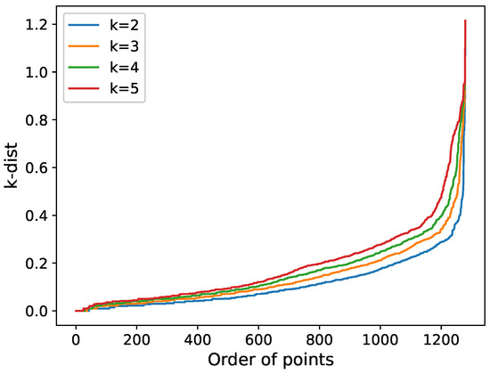 The determination of the Eps value is based on the location of the “valley” in the sorted k-dist map. The “valley” refers to a specific threshold at which the curve of the plot changes drastically, and the value of the vertical coordinate of this threshold is the Eps. However, it is a challenging task to determine the appropriate “valley” location precisely by visual inspection. Therefore, we must rely on reliable Eps selection methods, and for this purpose, we adopted the algorithm described by Guang Yu et al. in [32] to determine the “valley point”. The identified “valley points” are shown in Table 2.