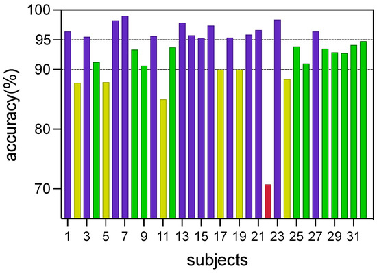 We conduct 5-fold cross-validation using the data of each subject, representing their mean classification accuracy and standard deviation as subject results, and then presenting these results combined as the average for the entire study population (32 subjects). The outcomes of the emotion classification model applied to the DEAP dataset are presented in Figure 8. Overall, the average accuracy for the 32 subjects is 92.98% with a standard deviation of 1.77%, and 25 subjects demonstrate classification accuracies higher than 90% in the experiment, with the exception of 2, 5, 11, 17, 19, 22, and 24. Among these, 14 subjects achieve accuracy levels above 95%. However, it should be noted that the accuracy of subject 22 is 70.75%, which is significantly lower than the others. discrepancy may be attributed to that subjects’ failure to provide accurate subjective feedback after the experiment.