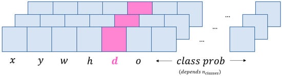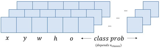 A prediction vector is given as , where ) are coordinates produced by the bounding box regressor, denotes the objectness, the confidence that the prediction vector captures a real object, and represents the confidence that the detected object is each of the classes. The classes represent the different objects that can be detected by the model. In total, each prediction vector consists of , which are constant for each object detector, plus values, which depends on the number of classes to detect, i.e., .