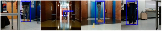 As mentioned in the introduction, the goal is to detect obstacles in a specific environment. Training the designed object detection and distance-estimation algorithm using only the KITTI dataset would not produce good results for the application, as it would not correctly represent the vehicle’s working environment. For this reason, 104 images of the specific environment in which the robot moves were collected and labeled. The images were captured at a resolution of 640 × 480 at the Vitoria-Gasteiz University of Engineering with a Logitech C920s webcam, and they were manually labeled using a laser meter to measure the distance to the obstacles (in this case people). The reason for detecting people as obstacles is that the vehicles we are working with (AGVs) are used for the transport of cargo in an industrial environment, so a possible application of this type of algorithm is to make the vehicle act autonomously when it encounters a worker. Another possible application could be the interaction of a service robot with people. Some images of the dataset are shown in Figure 4.