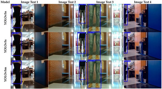 On the other hand, taking this into account, our algorithm uses a single monocular uncalibrated camera, as the only source of information. The use of deep learning algorithms allows for the generation of a flexible model in terms of the obstacles to be avoided: it can be trained in a customized way for just the desired obstacles. In addition, the proposed model offers very high performance with a very small dataset, with more than 75% of mAP0.5:0.95. For example, the official YOLOv5l algorithm has 49% mAP for general-purpose object detection. Furthermore, Table 4 shows that our algorithm provides accurate results when compared to other object-detection algorithms in similar mobile robot tasks. Some results of similar studies on environment recognition include Tiny-YOLO [] with and improved YOLOv4 [] with 67.6% and 86.8% of mAP, respectively. In comparison, our algorithm offers better accuracy, and the number of training images is more than 10 times lower. For distance estimation (see Table 5), our best model has an MAE of 0.71 m, slightly better than monocular camera distance estimation models in outdoor autonomous vehicles. Finally, our algorithm was easy to use and implement, and different versions of the algorithm are provided depending on the hardware available to deploy it.