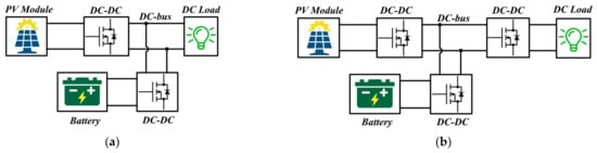 Topologies for coupling of battery storage to DC-link through bidirectional DC–DC converters: (a) DC load directly connected to the DC bus; (b) DC load connected to the DC bus through a DC–DC converter.