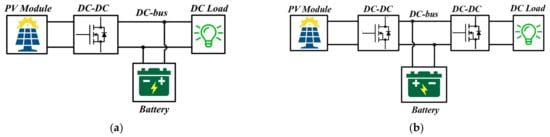 Amongst all the energy storage devices available, the battery is the most used one due to its high energy density and high performance. The battery can be sized considering different elements: the power quantity demand and the habits of use at NG level, the PV module power installed, the mean weather conditions in terms of irradiance and temperature, and, finally, the desired autarky. In any case, an efficient battery management system (BMS) is needed to make sure that the charging and discharging of the battery take place within its manufactured limits in order to protect the battery and increase its life [12]. The BMS continuously monitors the state of health (SoH), state of charge (SoC), the charge and discharge currents, and the voltage of the battery [13,14]. In the literature, several topologies exist for connecting the battery to the DC-bus. The DC-link can serve and receive current through the battery either through a bidirectional DC–DC converter [4,15,16,17] (Figure 1), which permits the effective implementation of the BMS, or through a direct coupling at the load side or the PV side [6,18,19,20] (Figure 2). A direct battery coupling architecture enables the reduction in the size of the system and possibly increases system efficiency even though it makes it very difficult to control the charge and discharge currents of the battery. Hybrid energy storage schemes consisting of battery and ultracapacitors have been implemented by [21,22] to provide for quicker charge and discharge rates, higher power densities, which is not possible only with batteries, and higher system stability. Generally, step-down converters are used when the PV voltage is higher than the battery voltage, while step-up converters are used when the PV output voltage is lower than the battery voltage.