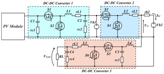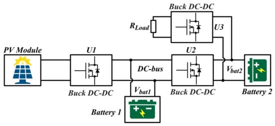 The standalone PV system under study is shown in Figure 3. It consists of a PV module, a buck converter (U1) to step down the PV voltage to a value acceptable by the BESS (battery 1), another buck converter (U2) which is used to charge battery 2, and the last DC–DC buck converter (U3), which provides regulated output voltage to the resistive load.